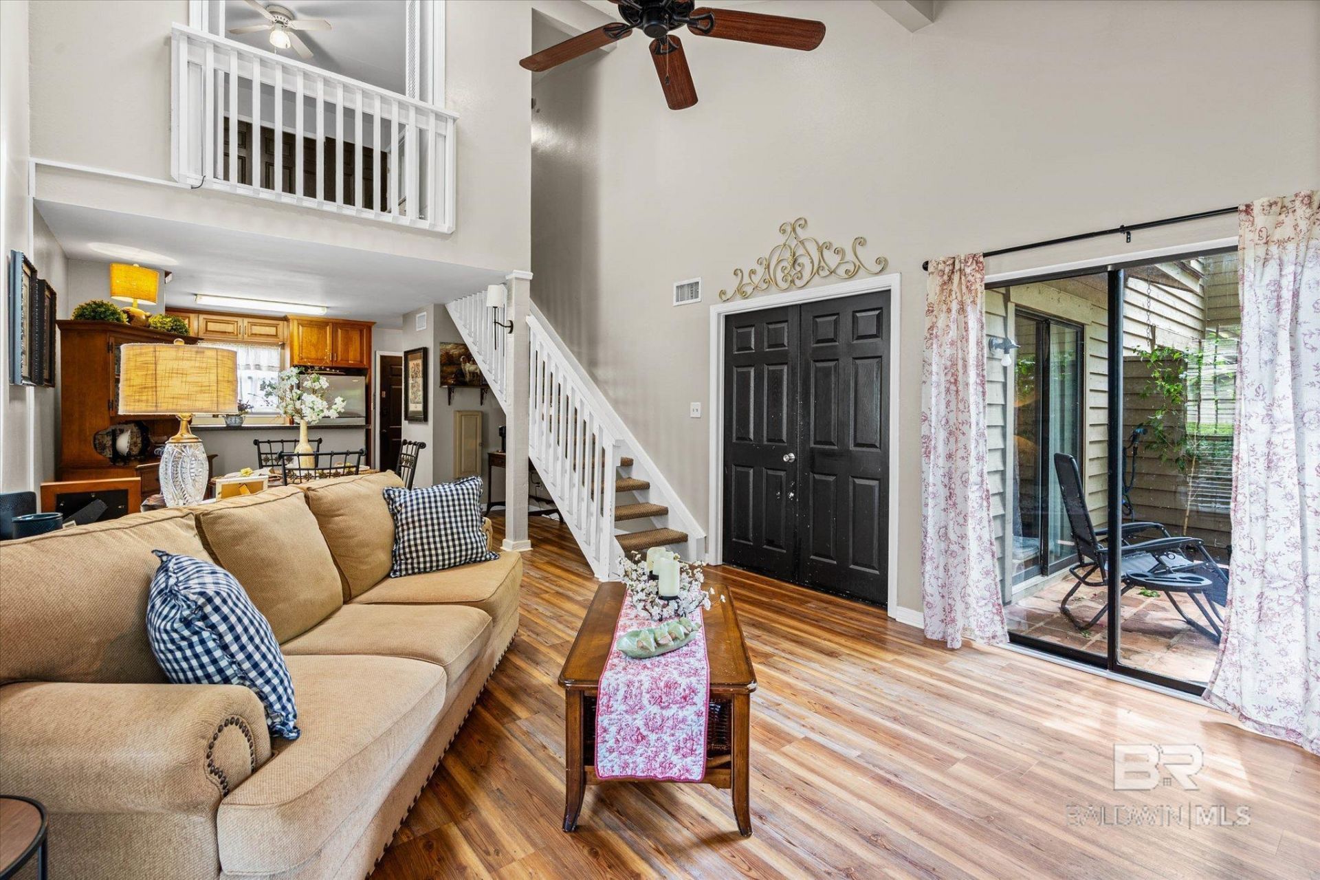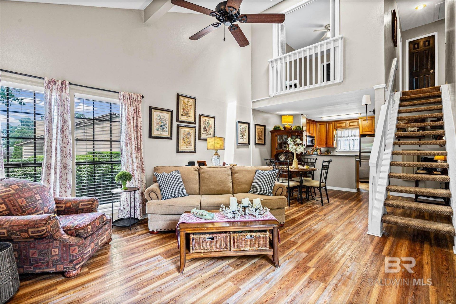 Relax on the front porch and take in the peaceful natural setting of this corner unit in Loma Alta Townhomes, perfectly positioned right across from green space. This charming 3-bedroom, 2-bath home makes the most of its footprint. The open floor plan, soaring vaulted ceiling, and large gas log fireplace create a spacious area perfect for relaxing or entertaining.The main level features new LVP flooring and a primary bedroom with an en-suite bath, including a dressing area and a large closet. The layout is designed for convenience, with hallway access to the primary bath for guests. The dining space flows nicely into the kitchen with a breakfast bar, making it a great spot for everyday meals and special occasions. The full kitchen features stainless steel appliances, a small pantry, as well as space and connections for a stackable washer/dryer.Upstairs, you'll find two generously sized bedrooms, a full hall bath, and additional storage with large hallway closets. Out back, there's a secure storage room with plenty of space for your extras. This unit also has an active termite bond.Whether you're looking for an investment opportunity or a place to call home, this one checks a lot of boxes. Don't miss it! Buyer to verify all information during due diligence.